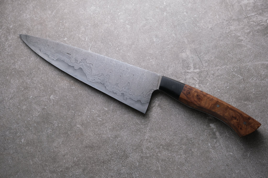 8 Inch Carbon Steel & Wrought Iron Chefs Knife With Elm Burr & black G10 Handle
