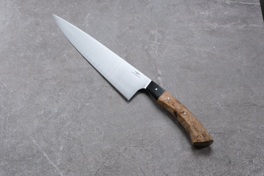 This handmade 9 inch chef's knife is crafted with 1095 steel. It's high carbon steel that's tough and is easy to resharpen with a basic sharpening kit.